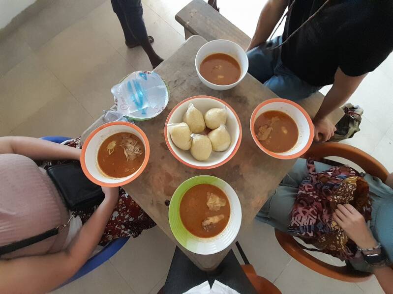 Am Samstag war ich dorthin eingeladen zu einer End-Of-School-Feier vor den Sommerferien. Zum Frühstück gab es Banku (fermentierter Mais) mit Groundnut Soup und Hähnchen sowie jeweile einer Krabbe. Die Freundin, ich nenne sie hier Destiny, berichtet dass sie bereits um 3 Uhr morgens aufgestanden ist, um zum Markt zu fahren. Wir machen uns zu Fuß auf zu der Feier und werden natürlich direkt hofiert, die vier Weißen bei der Schule im Ort. Die Schule feiert sich nun als International und ist erfreut über den hohen Besuch, dabei haben wir ja gar nichts geleistet. Wir werden auf die Bühne gebeten, um uns vorzustellen, und ich bin froh, dass ein Kollege das Mikro in die Hand nimmt und ich so nur mit der jüngsten Tochter auf dem Arm lächeln und winken muss. Für den Sohn der Familie übernehme ich für den Tag eine Patenschaft und spende ein wenig Geld an die Schule. So habe ich die Ehre, ihm als Erstes zum Bestehen der Vorschule zu gratulieren. Die Familie ist schick angezogen und die Kinder wirken recht glücklich. Es ist schön, die Schule und die Community zu sehen und durch die Nachbarschaft zu laufen. Doch trotzdem hinterfrage ich es natürlich auch. Für mich ist es ein Besuch in eine fremde Welt, für die Menschen hier das Leben. Und ich möchte gar nicht zu sehr mit Mitleid auf diese Art des Wohnens blicken. Ich will den Menschen nicht überstülpen, dass sie doch bestimmt leiden, doch ich bekomme es durch meine Freundin ja mit. Jeden Tag kommt sie zur Uni zum Arbeiten, da sieht sie ja auch, wie wir auf dem Campus leben und wie es ist, sanitäre Einrichtungen und Strom zu haben, und sieht, in welchem Maß gerade wir Internationals Geld ausgeben können. Sie beschwert sich auch über die Politik und berichtet mir, dass sie nicht wählen geht, weil sie kein Vertrauen hat, keine Hoffnung auf Besserung. Sie berichtet auch von einigen Schicksalsschlägen in ihrem Leben, und ich bekomme ein Gefühl dafür, wie es ist, wenn kein Sozialstaat hinter dir steht, wenn es mal schwierig wird. Es ist Ende des Monats und ihre Chefin kommt einfach nicht vorbei, um ihren Lohn zu zahlen. Und dabei braucht sie doch jeden Cedi. Ich helfe ihr auf die Sprünge und hoffe, dass ich nicht zu überheblich dabei rüberkomme.